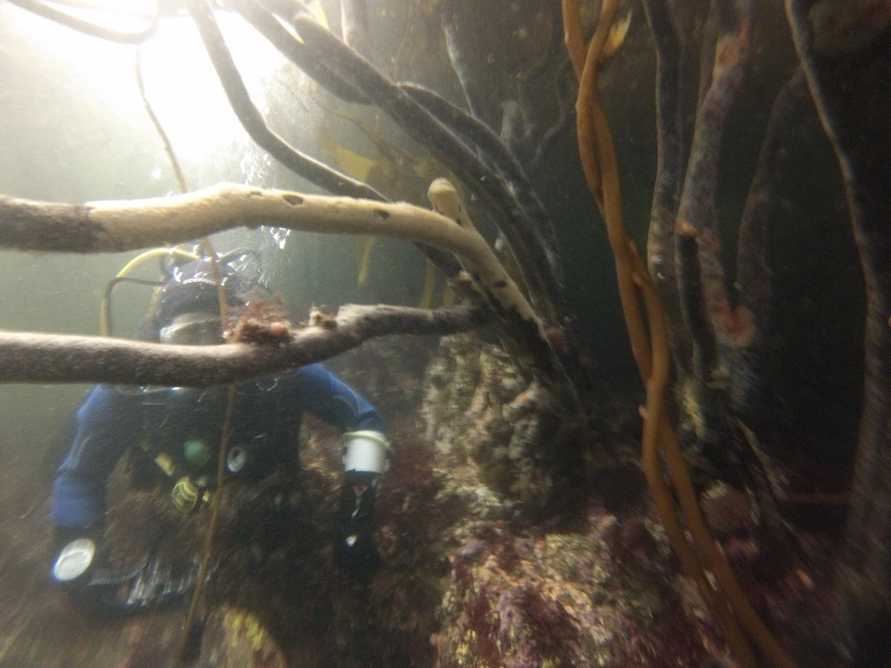 Whilst collecting on a beach where you can stand on something solid whilst holding a piece of rock in one hand and using the forceps in your other hand to pick off a worm that might be only a few millimeters long is challenging. Trying to do this underwater, whilst you have one hand on the rock to try and steady yourself against the rolling ground swell that is trying to alternately tangle you in the kelp or pound you against the rock that you are trying to prize a sample off with the dive knife that you are holding in your other hand is a different matter altogether (photos 2 & 3)! The really challenging thing was that after you had managed to prize the sample off the rock you need to get it into a plastic sample bag (ziplock freezer bag) without losing everything – apparently I failed in this respect. Whilst I can’t hide the fact that the trowel and the all important brass snap lock (yes she has mentioned it more than once) did get left behind my argument is still that the sample was more important and that was recovered! I also never realised just how difficult it could be to open, put something into and then reseal a zip lock bag whilst wearing neoprene gloves that are 5mm thick!
