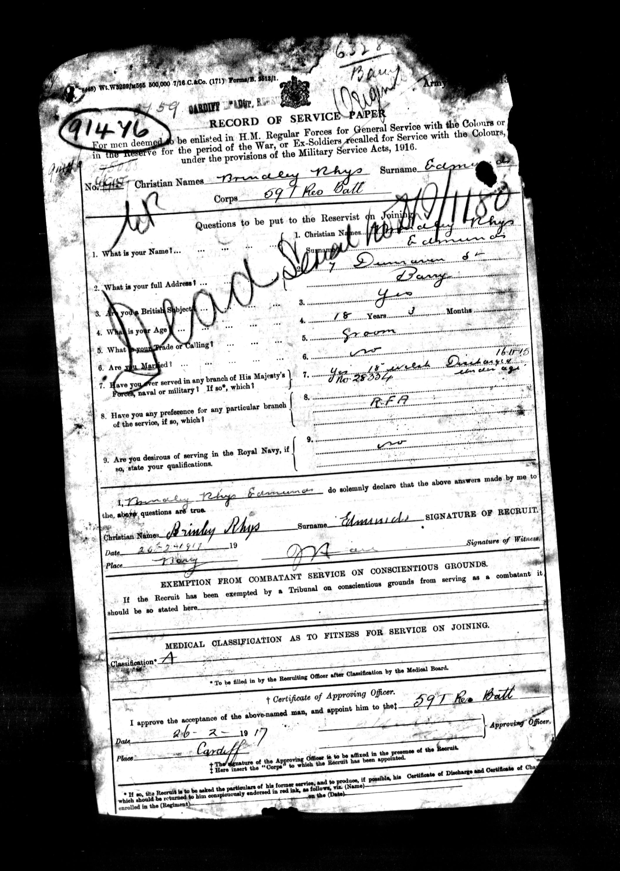 On this day in 1917, Brinley Rhys Edmunds, an 18 year old groom from Barry, joined the army – one teenager among the 272,924 Welshmen who served during the First World War.