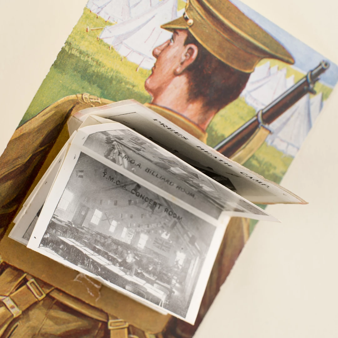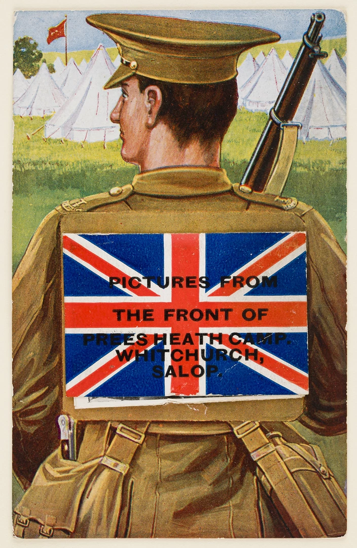 Frustrations aside, we’re fortunate to have several objects in the collection which were donated to the Museum by Brinley’s family in the late 1970s and early 1980s. They are among the most powerful and poignant of all the First World War collections in our care. Although undated, the postcard shown here was almost certainly written by Brinley when he served with The Welsh Regiment. In July 1915, the 18th Battalion moved to Prees Heath training camp in Shropshire. This novelty postcard, addressed to Brinley’s parents, includes a set of pull-out images of the camp.