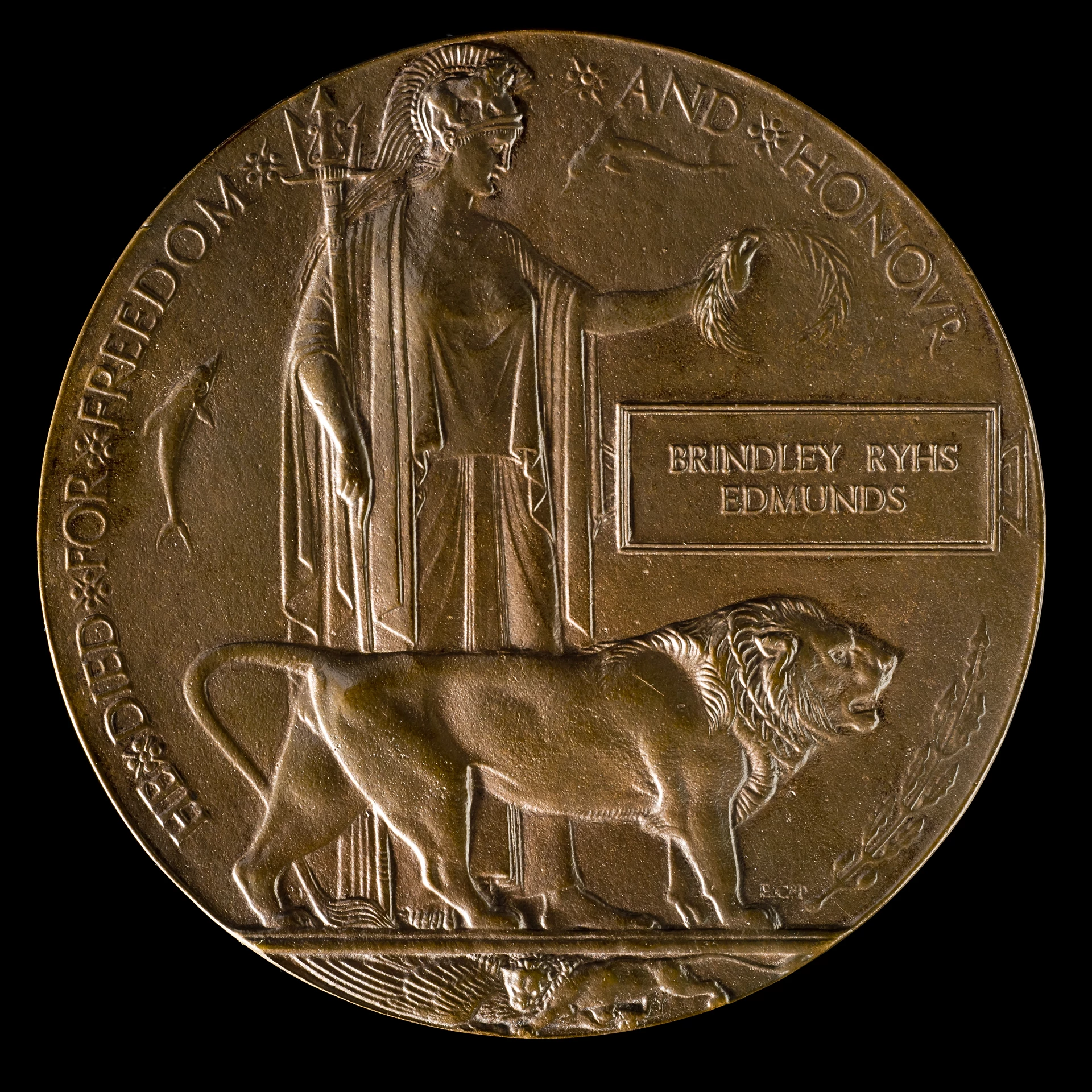 Brinley Rhys Edmunds died on 5 September 1918 while serving with the Durham Light Infantry, a matter of weeks before the armistice and his twentieth birthday. He is buried at the Berlin South-Western Cemetery in Germany. With no grave to visit at home, his family preserved and displayed the pincushion under a glass dome. Like all families who lost a relative in the line of duty, Brinley’s parents received a bronze memorial plaque in recognition of his service, inscribed HE DIED FOR FREEDOM AND HONOUR BRINDLEY RYHS EDMUNDS – the error made by the Cardiff recruiting officer compounded by the misspelling of his middle name, Rhys.