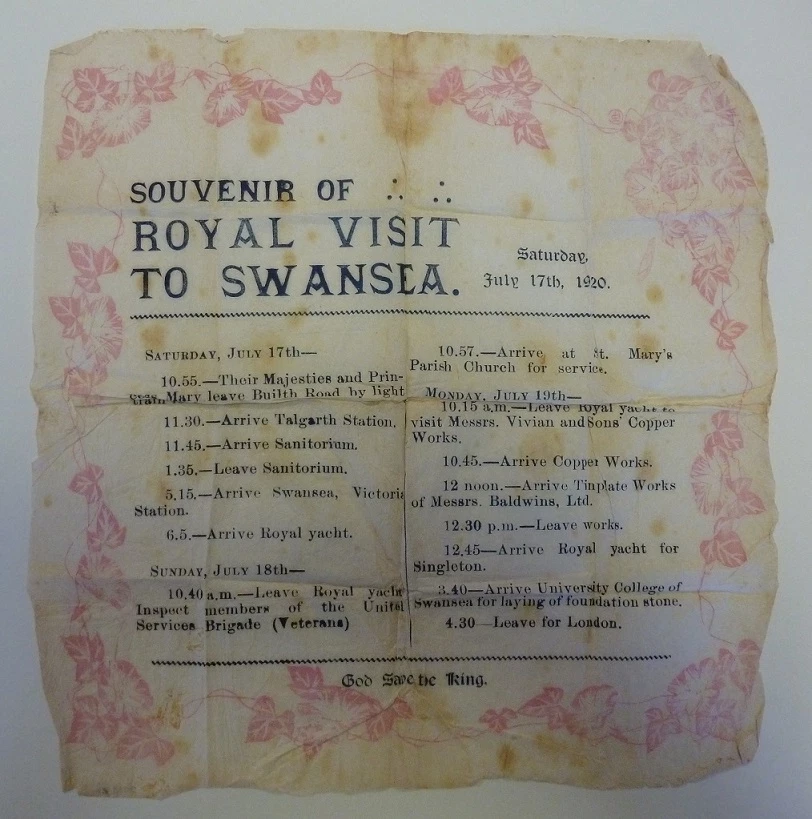 This paper serviette was produced to celebrate the visit of King George V and Queen Mary to Swansea on 17th – 19th July, 1920. Staying on the Royal Yacht; on the Monday they visited Talgarth Sanatorium and on the Sunday they attended a service at St. Mary’s parish church, Swansea. On Monday the King and Queen visited Hafod copper works which was owned by Vivian & Sons, and then Kings Dock tinplate works (owned by Baldwins Ltd.). Finally they laid the foundation stone of University College, Swansea.