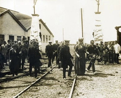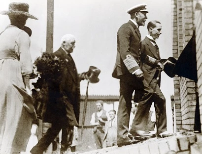 The two images below form part of the museum's historic photography collections, and show the Royal Visit to Kings Dock tinplate works on 19th July 1920. In the first photograph Queen Mary (at centre) and King George V (towards the left) can be seen walking over railway lines at the tinplate works. The next photograph shows King George V entering the works.