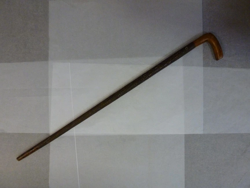 A yardstick (or Deputy’s stick) was carried by officials of the coal mines an aid in the process of testing for gas. Before about 1960 there was a hole at the top of the stick into which the deputy could fit the hook of his lamp in order to raise it into the roof to test for gas. This example has been adapted as a walking stick. About 6" has been cut off one end (removing the hole to raise the lamp) and a curved length of wood attached to form a new handle.