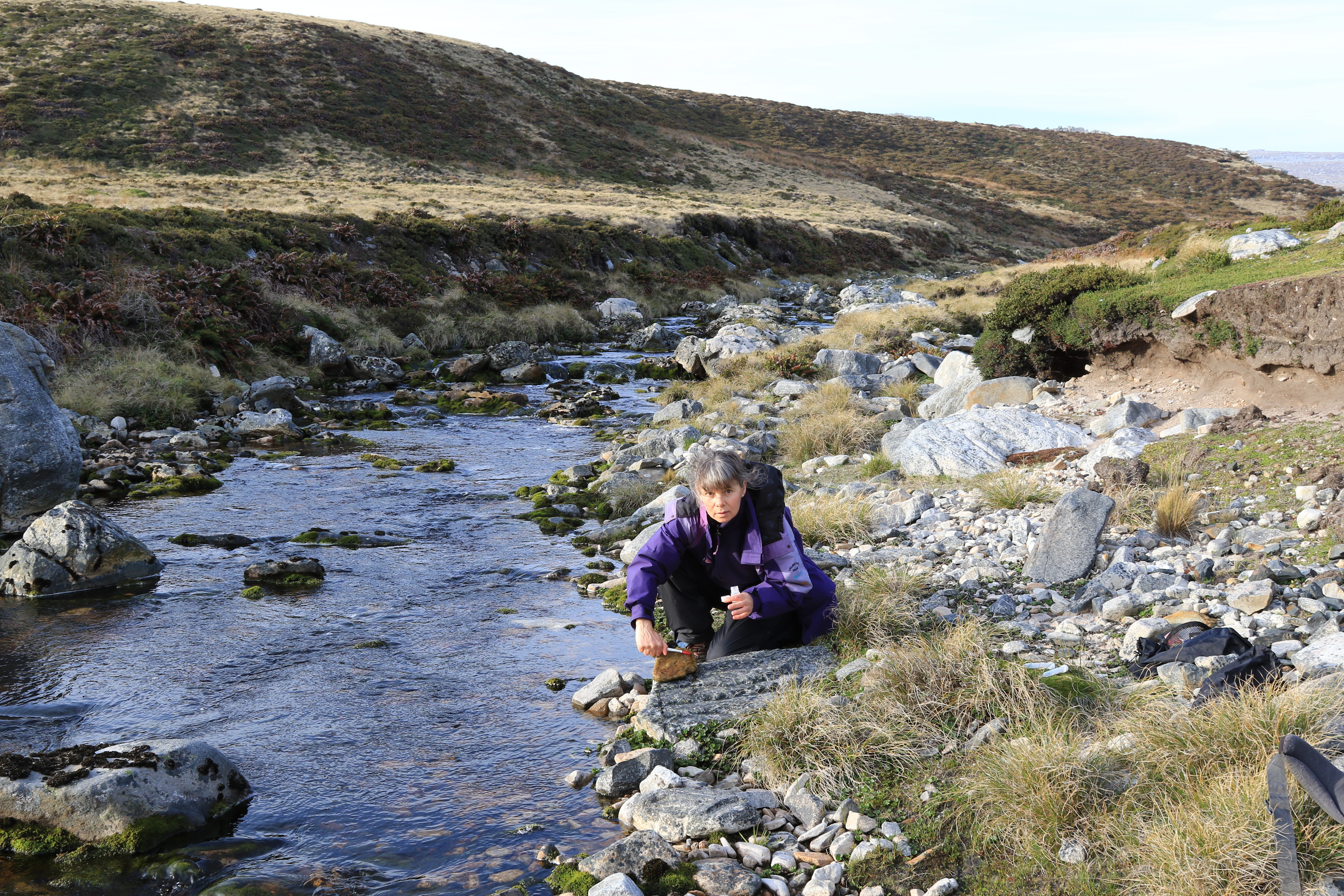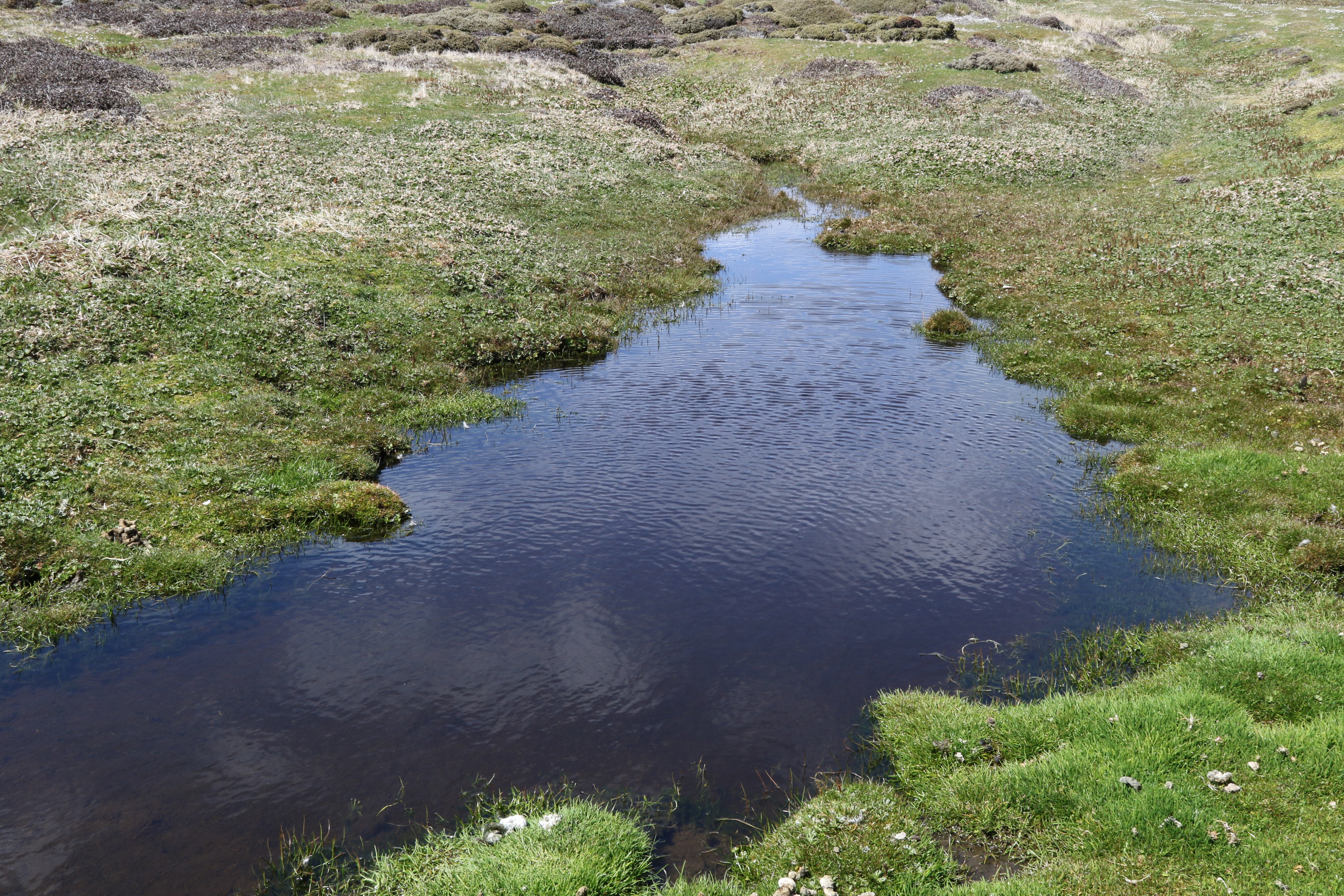 In the western area of the island I took samples from various types of springs, such as a spring with stagnant water (known technically as a limnocrene), a flowing spring (rheocrene), a captured spring supplying drinking water to the Pebble Island settlement, several seepage areas and a stream.