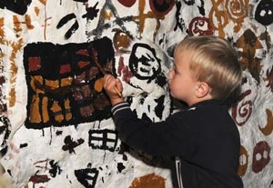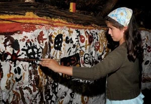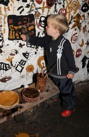 In the roundhouse next door Ian Daniel, interpreter in the Celtic Village, ran wall painting workshops. Tired of the house’s plain white walls, Ian had decided to enlist the public’s help in transforming them with Celtic designs drawn from a portfolio compiled by museum conservator and Iron Age art specialist Mary Davis. By the end of the day dozens of children had covered every spare inch of white wall with an amazing array of designs – all painted with natural pigments.