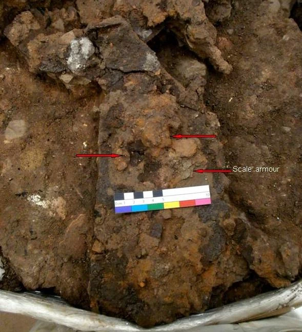 As mentioned above, obvious fittings that are immediately identifiable still haven’t been found, and careful excavation has only managed to produce vague shapes of what is essentially metal corrosion. I have included in the last photograph a view of an area of probable lorica attachments and fittings, though only a very good quality x-ray will be able to make any sense of these lumpy features.