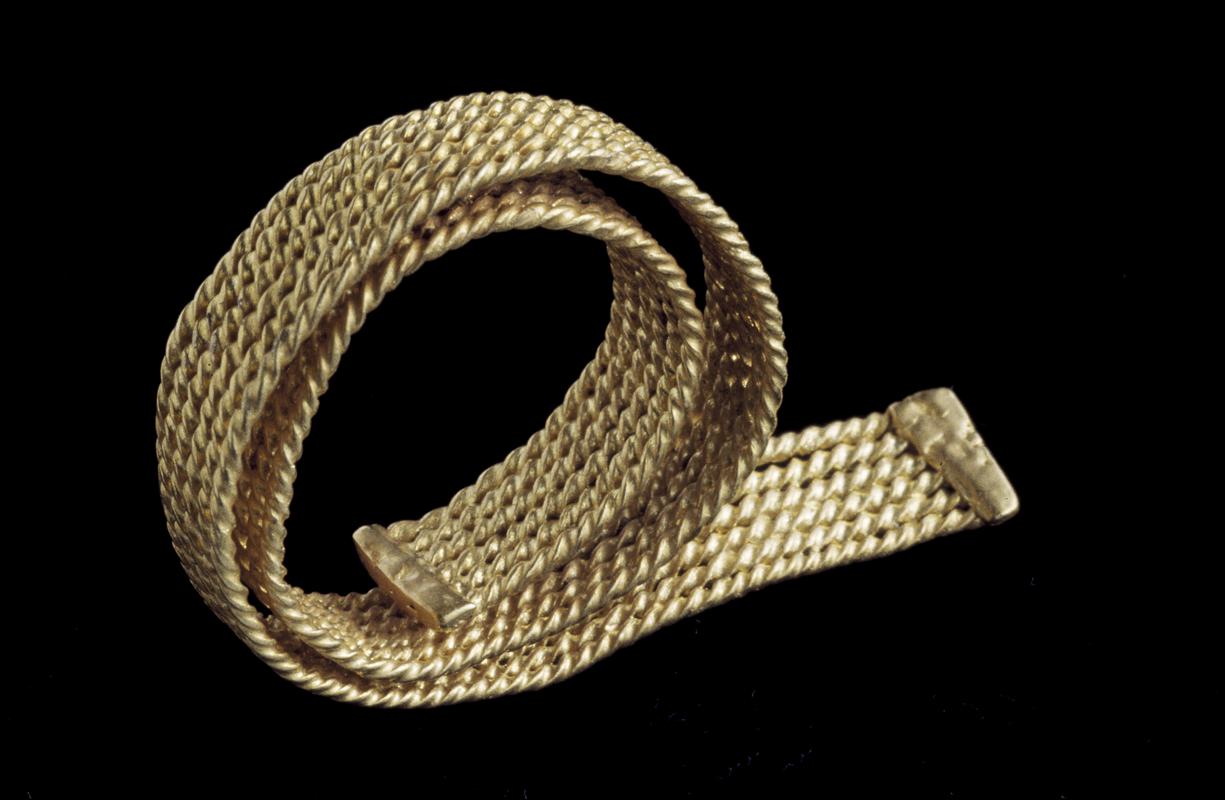 A Middle Bronze Age hoard (1300-1150 BCE) comprising twelve items of gold jewellery, two bronze palstaves, a bronze chisel and the base fragment of a pottery vessel.