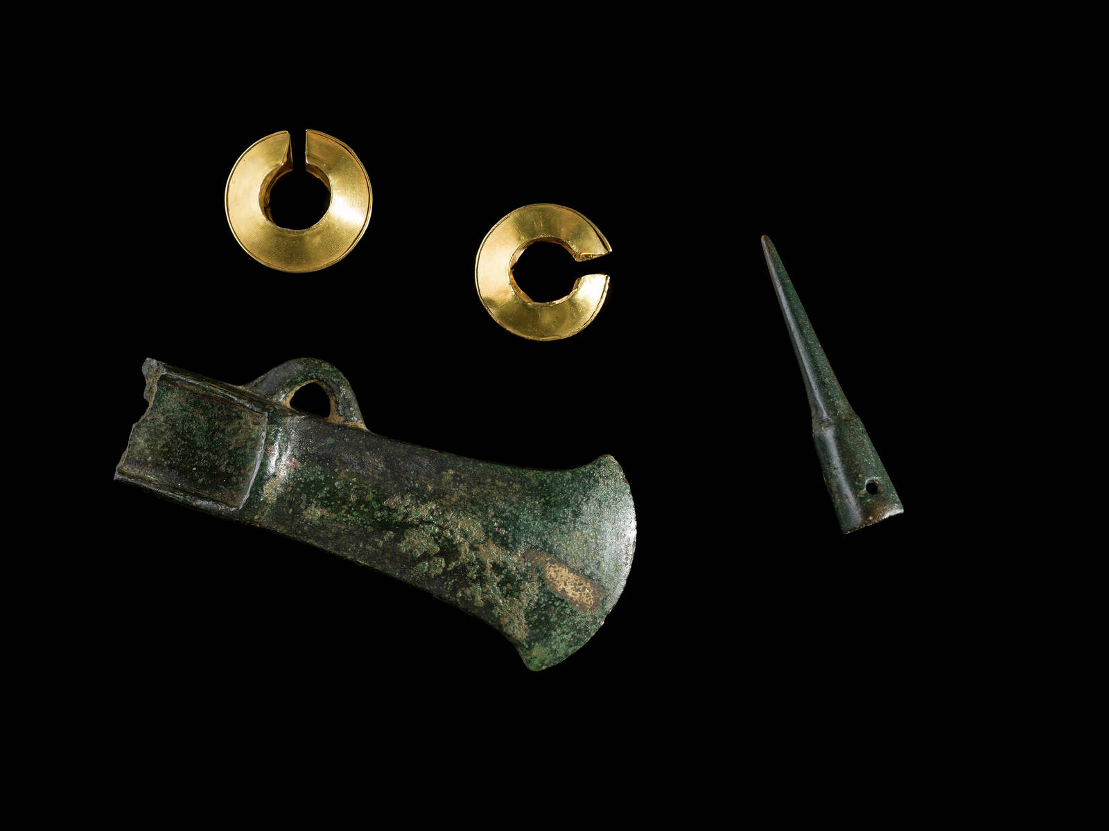 A Late Bronze Age hoard (1000-800 BCE) including two gold hair ornaments called lock-rings, found with two bronze tools: a palstave and a socketed awl.