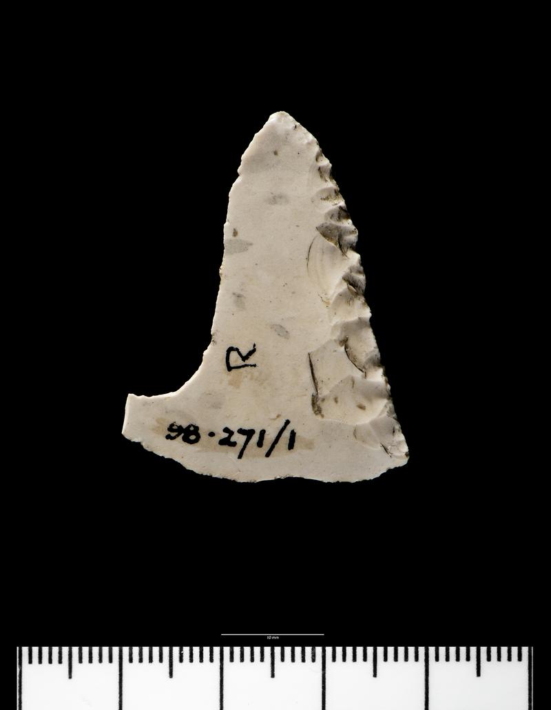 Flint traverse arrowhead, 3000-2500 BCE, from Merthyr Mawr, south-east Wales. Pieces of bone or antler were used to press thin flakes from the edge of a piece of flint.
