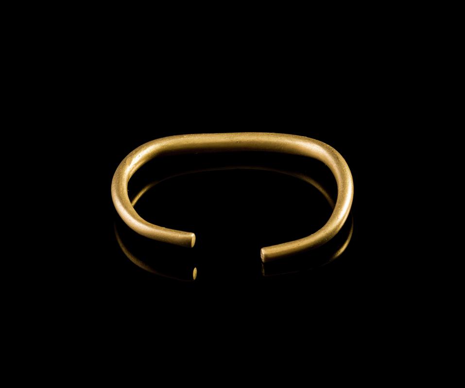 This decorated gold strip fragment is thought to be the end fragment once belonging to a bracelet. The design, created by using a stamp, was intended to create a twisting effect resembling four twisted gold wires. A perforation at the centre of the flat-ended terminal was probably used to tie together the bracelet around the wrist, using braid or gold wires. Analysis of the metal indicates a composition of around 80% of gold, also with lesser silver and copper components. This signature is similar to other gold artefacts from Wales of Middle Bronze Age date.