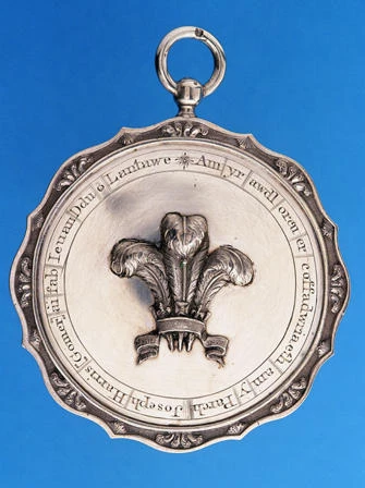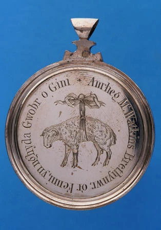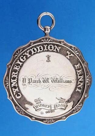 In the Museum at St Fagans there's a very good collection of medals and other prizes won in the eisteddfodau of Cymreigyddion Y Fenni. Here are just three of them. This is one from the year 1834, a medal won by a man who called himself Eiddil Ifor, an essayist who competed quite regularly in the eisteddfodau. The Abergavenny eisteddfodau, as you might expect, gave some prominence to essays on subjects associated with Welsh history, both local history such as that of Abergavenny and the area, and of course Welsh history in a broader sense. Eiddil Ifor competed regularly and there are probably a good half-dozen of the fine medals he won here in the Museum.