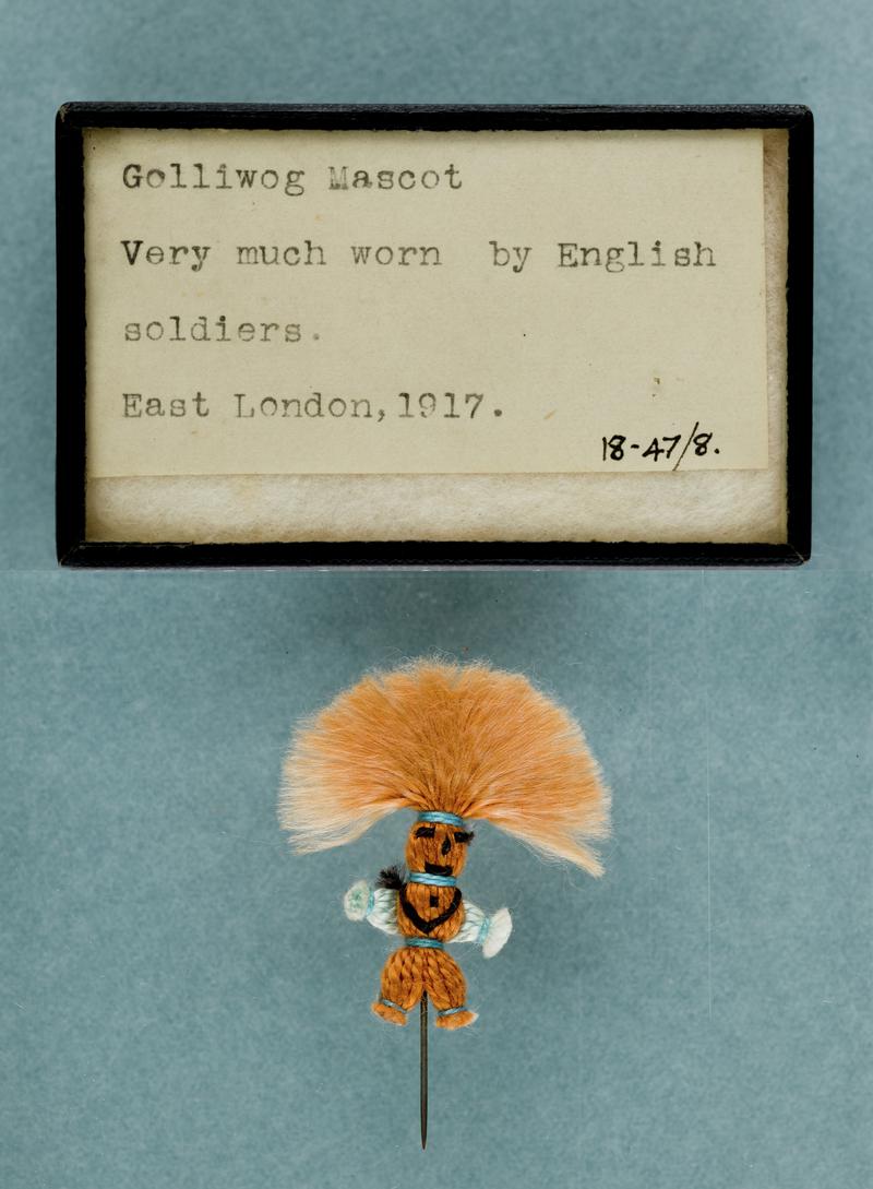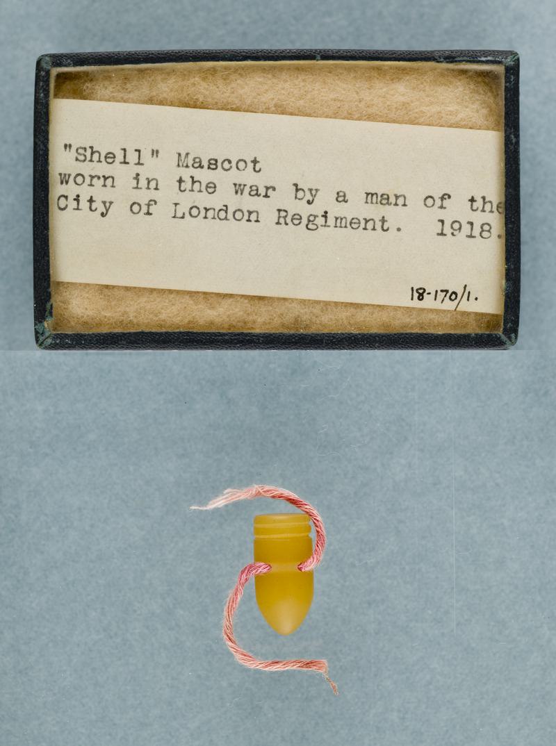 Amulet in a box, with a typed note: 'Lucky Horse Shoe mascot: made of copper from German shell by Belgian soldiers in the war. 1917'. Acquired by the Museum in 1918 from Edward Lovett, a folklorist and collector from Croydon.