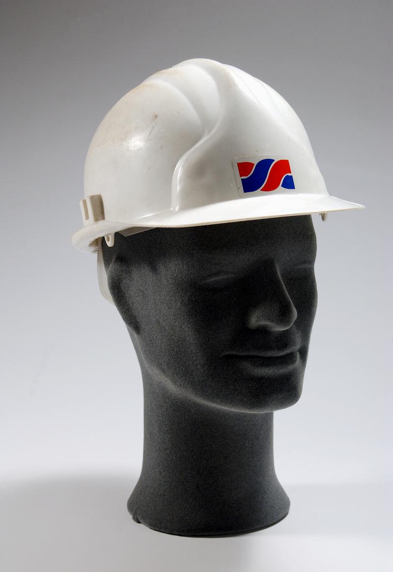 Furnace man's safety helmet. White helmet with plastic clear shield at front and spectacles with green lenses, black cloth to protect neck.