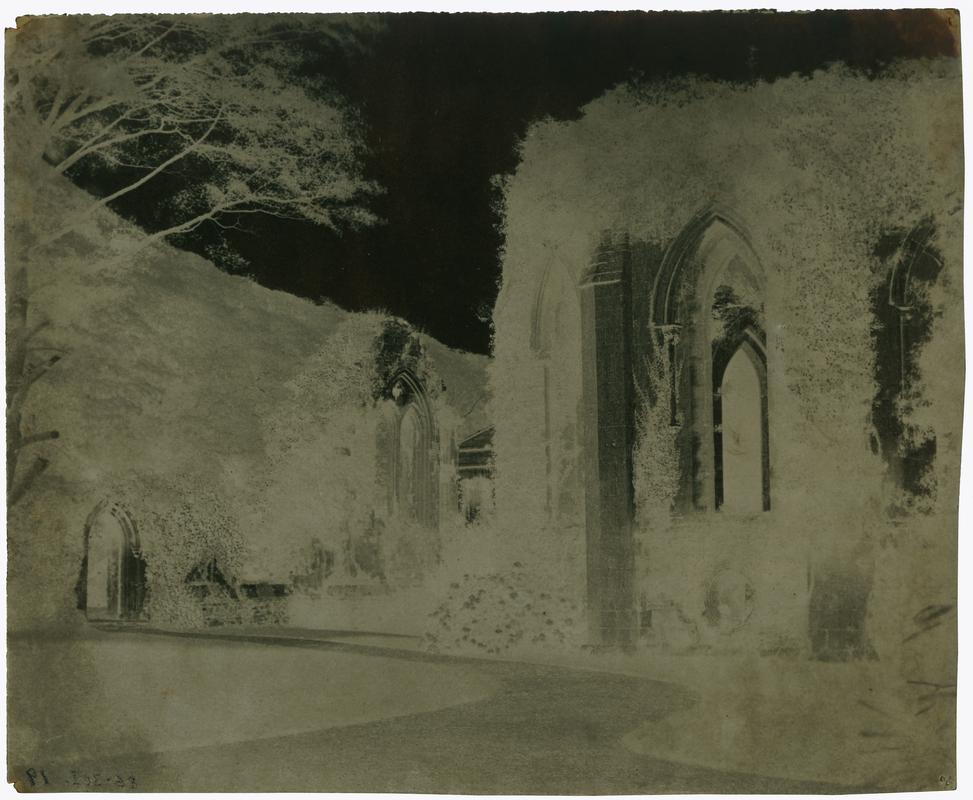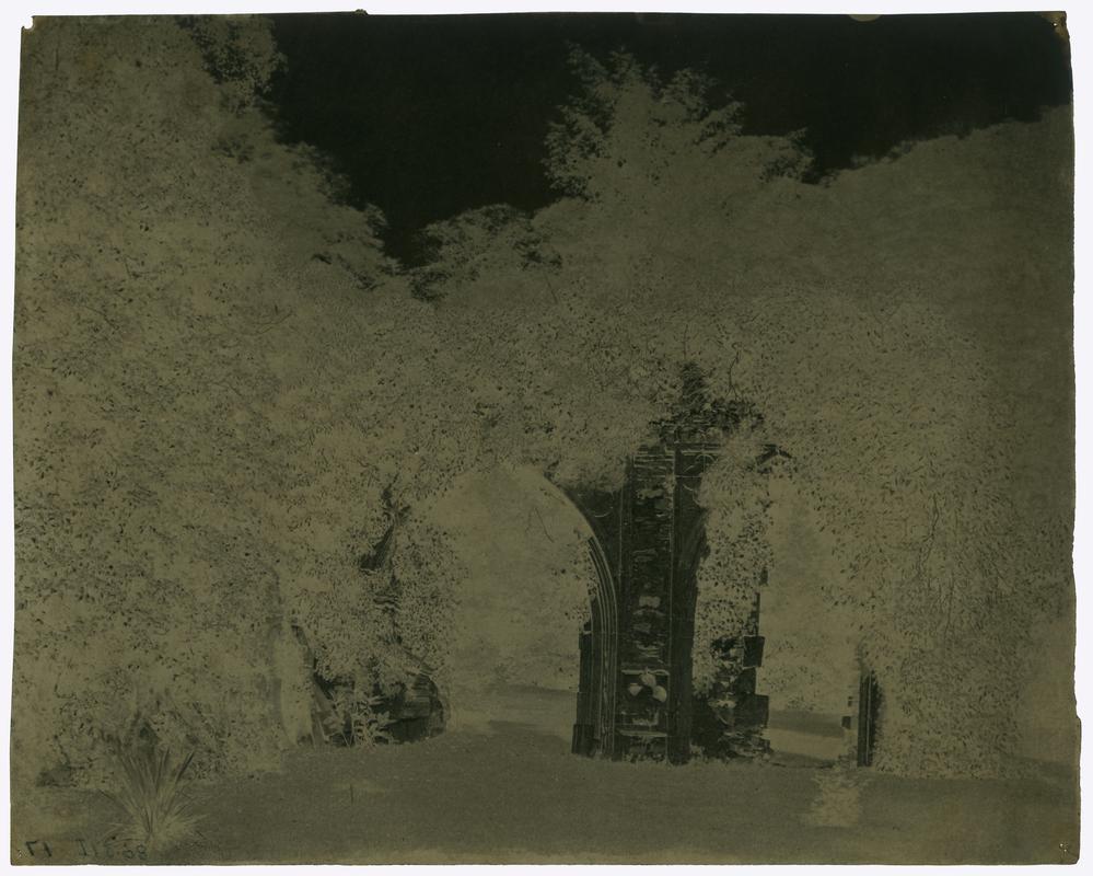 Calotype (negative). View of ivy clad Tintern abbey with low wall in foreground. Tabs on top left hand side and two on the bottom.