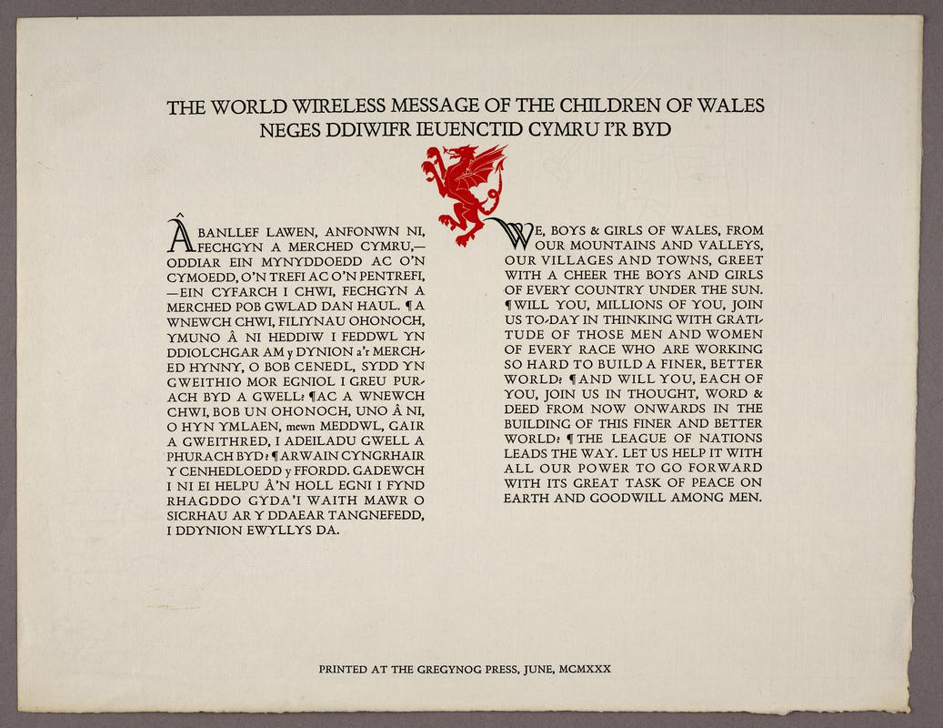 Medal commemorating the peace celebrations at Bethesda, 1919. Inscribed: PEACE / I GOFIO AM FUDDUGOLIAETH Y RHYFEL FAWR. One of 800 medals ordered from Fattorini & Sons Ltd. Bradford by Mr Edward Jones of Bethesda paid for by public subscription.