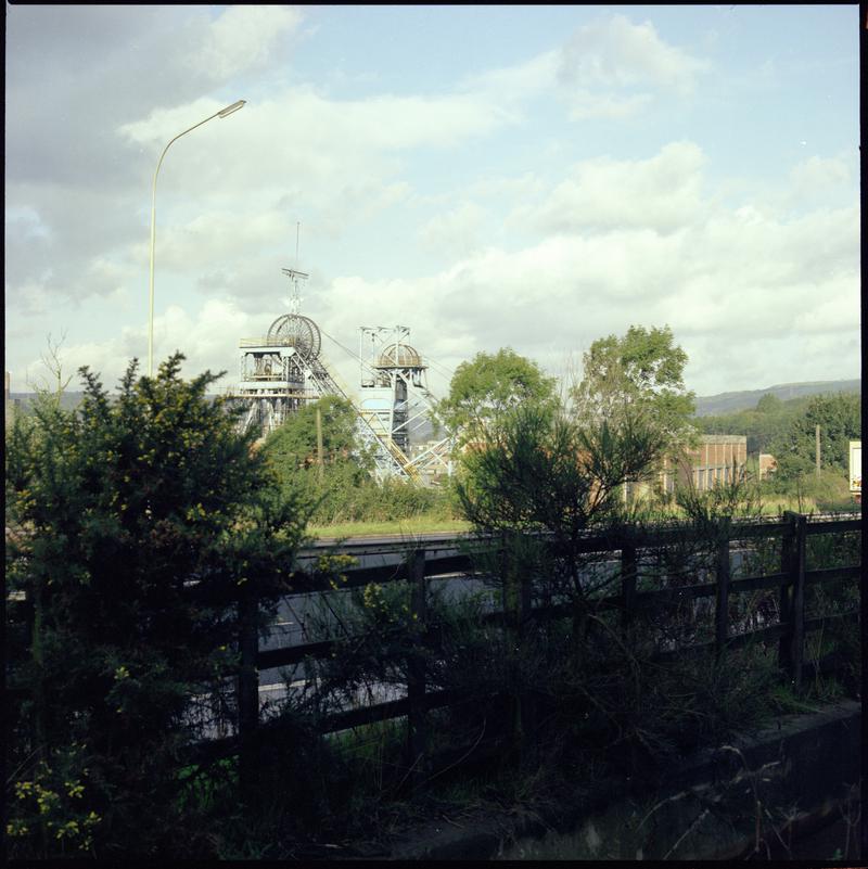 Black and white film negative showing the changing of shaft guide ropes at Marine Colliery. 'Marine' is transcribed from original negative bag.