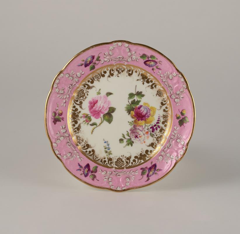 Sucrier and cover of soft-paste porcelain, standing on a tapering foot rim, high shouldered sides of rounded oblong shape ending in a shelf-type convexly curved lip rim; domed cover, pyramidal finial with faint beading effect on upper section; horizontal gadroon moulded handles; the lower body and cover painted with floral arabesques in red green and gilt, running tulip border in gilt on lip rim, feathered gilding to moulding on handles, gilt band to foot rim, upper shoulder, lip rim, base of cover and around finial, finial painted in gilt.
