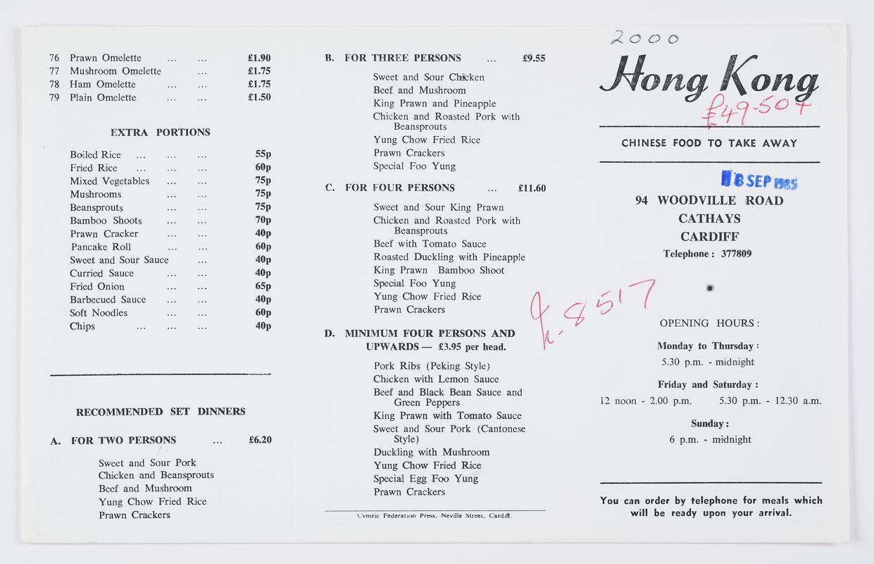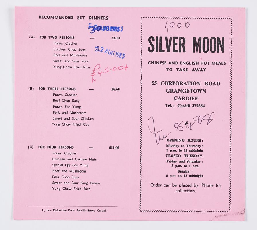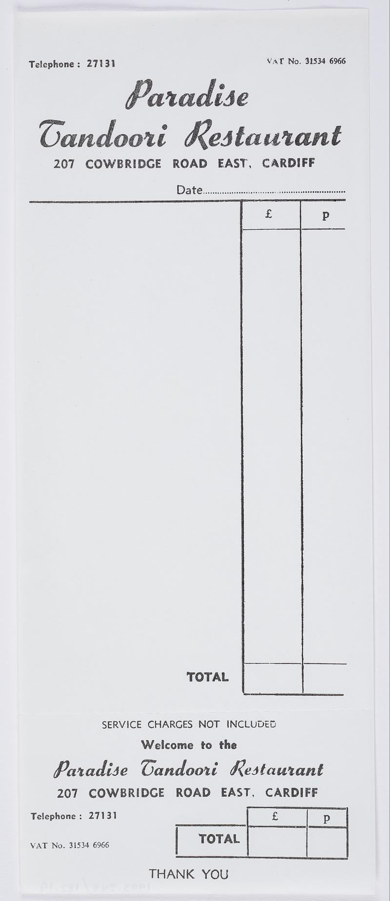 Business card printed for 'Paradise Tandoori Restaurant', Cardiff. Handwritten order details on the front. Stamped with date 27 November 1981.