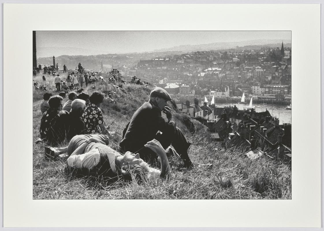 A sunny sunday afternoon brings tourists and residents on to the hill overlooking Whitby harbour to relax and dream. England, Whitby