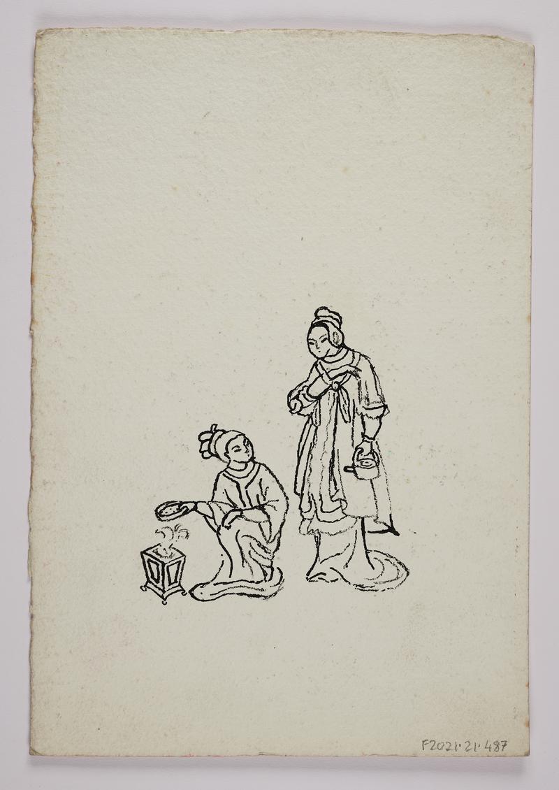 Black and blue ink drawing of a ship in sail.