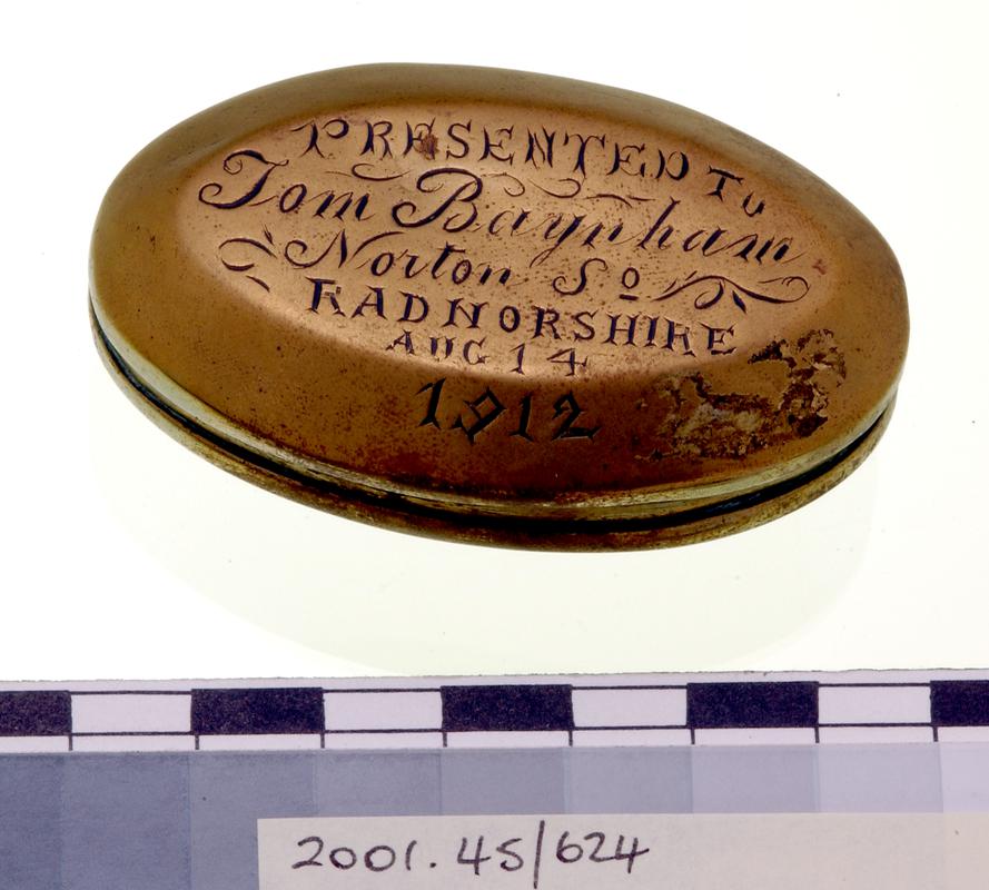 Brass oval twist box with inscription and stamped decoration on top hinged lid and on bottom.