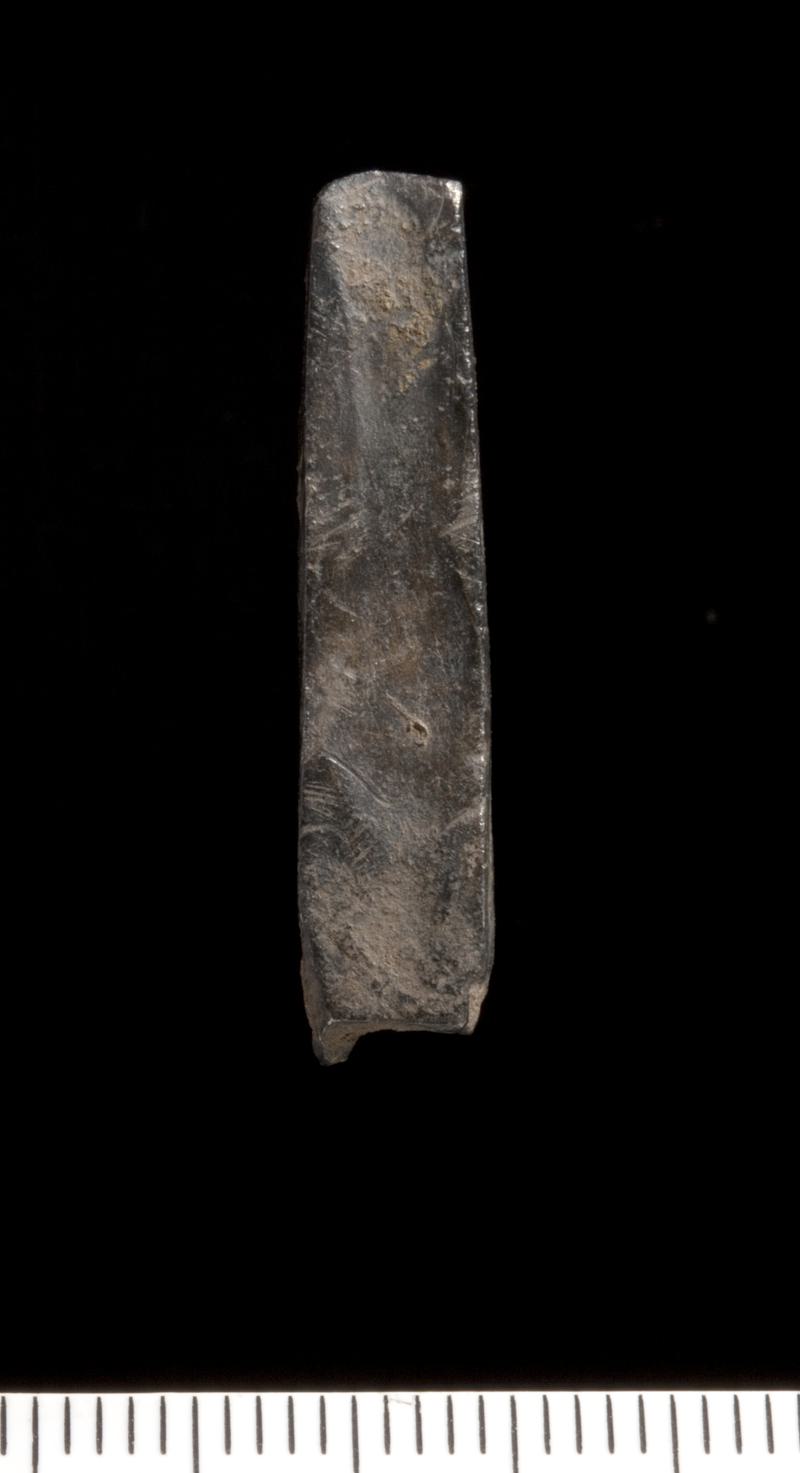 Narrow 'finger shaped' lead ingot with sub-rectangular cross-section, bent back on itself.