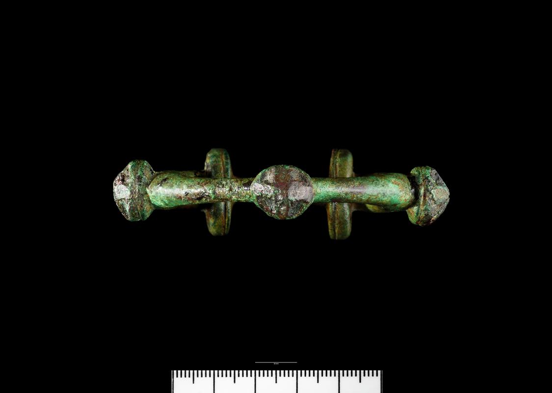 Part of a hoard, dating to the period 50-75 CE. It was buried at a time when the Silures, the native tribe of south-east Wales, were fighting a guerilla war against the Romans. The hoard consists of a mixture of both native and Roman military objects.