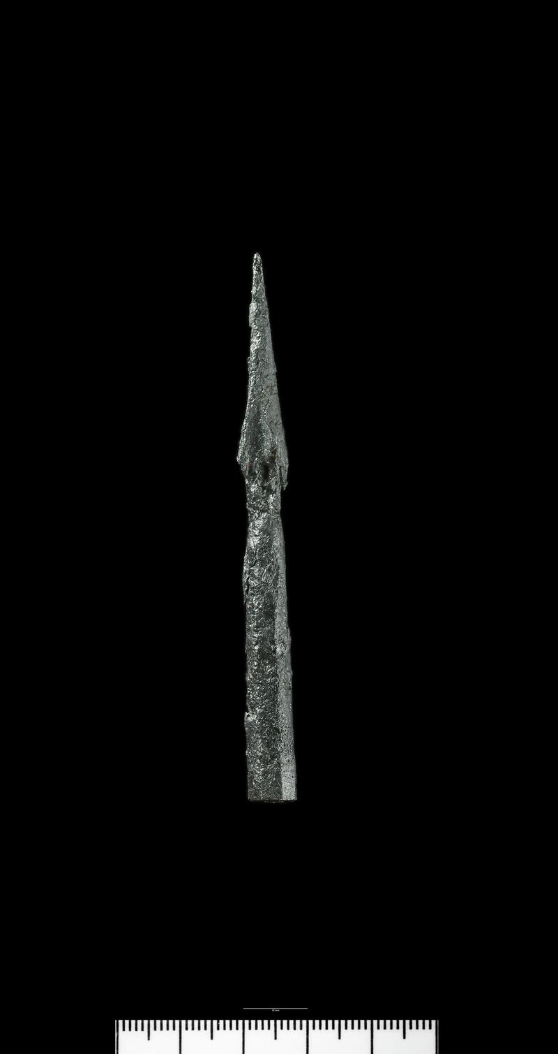 Arrowheads were attached to the shafts by means of either a socket or a tang. Vaned, socketed arrowheads were composed of a socketed head with three or four barbed vanes. This example is a quadruple-vaned arrowhead.