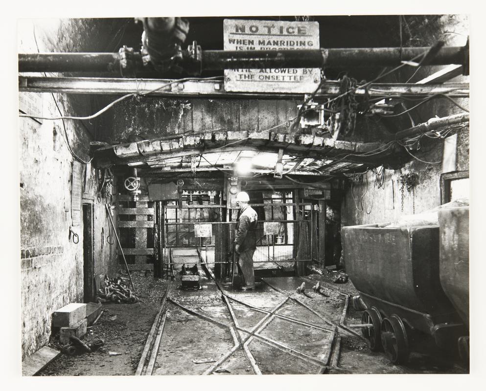Man riding cars underground at Graig Merthyr Colliery. National Coal Board stamp on reverse.