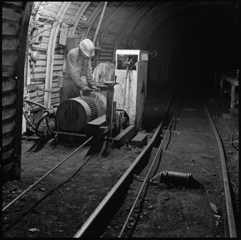 Colour film negative showing a Anderson Strathclyde shearer on a chainless haulage face, Nantgarw Colliery.