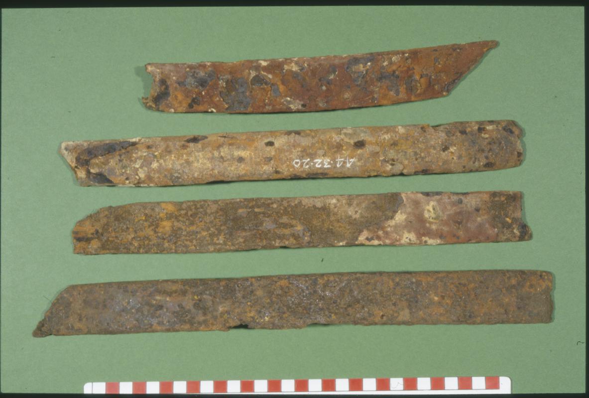 Notes: Found during the construction of an airfield at RAF Station Valley. Some certainly, the rest probably, from a wet meadow which formed the margin of Llyn Cerrig Bach. The exact depth below the grassy surface at which the objects were deposited is not known. The bog was excavated to a maximum depth of 20 feet. A few objects were found on the spot, after the peaty deposit had been won from the boggy margin of the lake. The rest, with the exception of 44.32/58, were found on that portion of the adjacent aerodrome on which the peat from this site had been spread. Animal bones were associated with the deposit and many metal objects were stained with vivianite.
