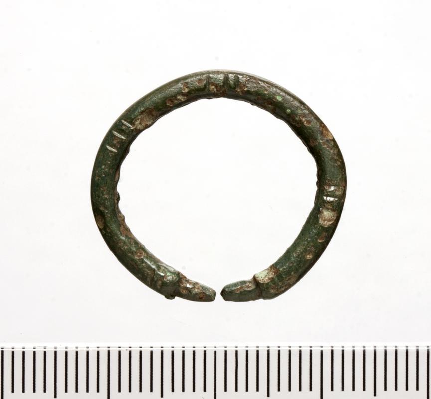 Bone pin with spherical head, shaft tapering to point (damaged). Surface of pin head is decorated with incised lines in a crude cross-hatch pattern. Below the head, on the shaft is the same cross-hatch pattern between a single line border. This pattern is repeated in a single band across the middle of the shaft, half way down.