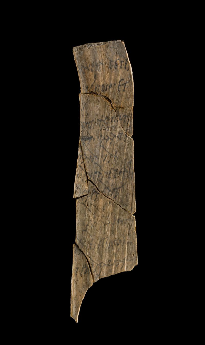 About half the tablet survives. Recess for wax cut on both sides with an additional flat wide groove running horizontally across one side. Single square hinge hole. Surviving long edge broken off at cut for binding thread. Badly distorted.