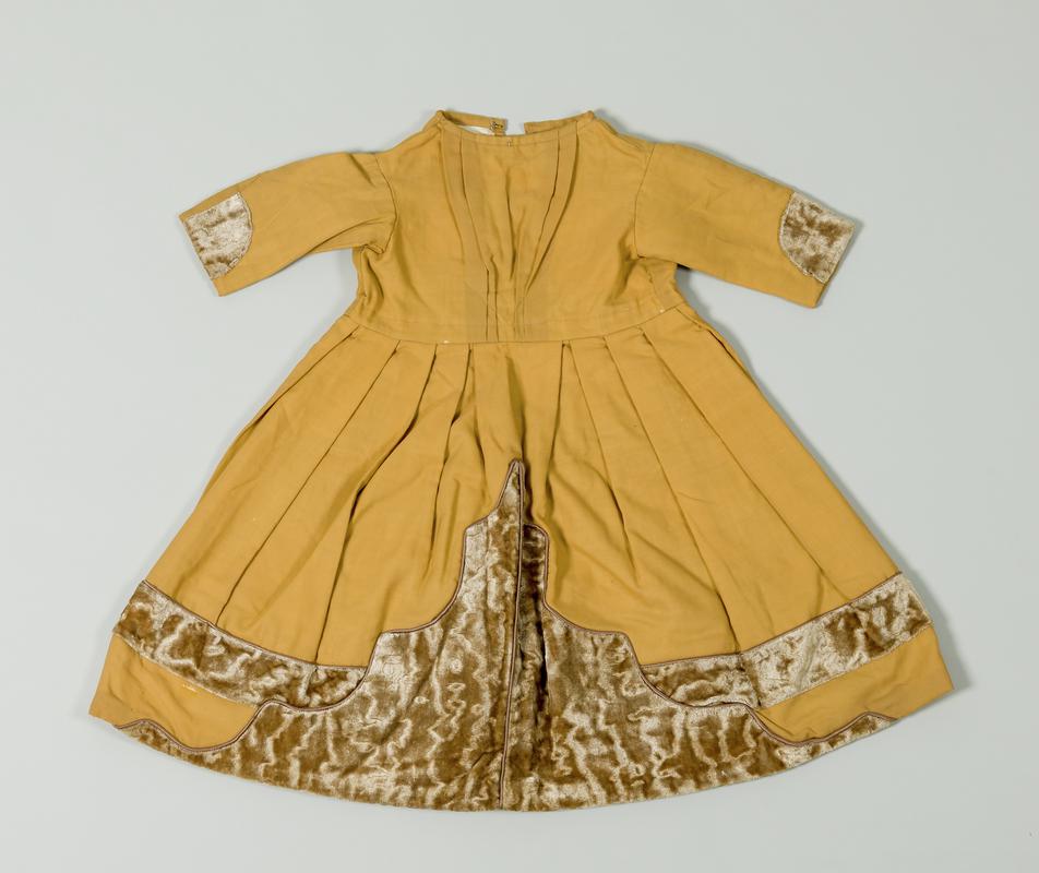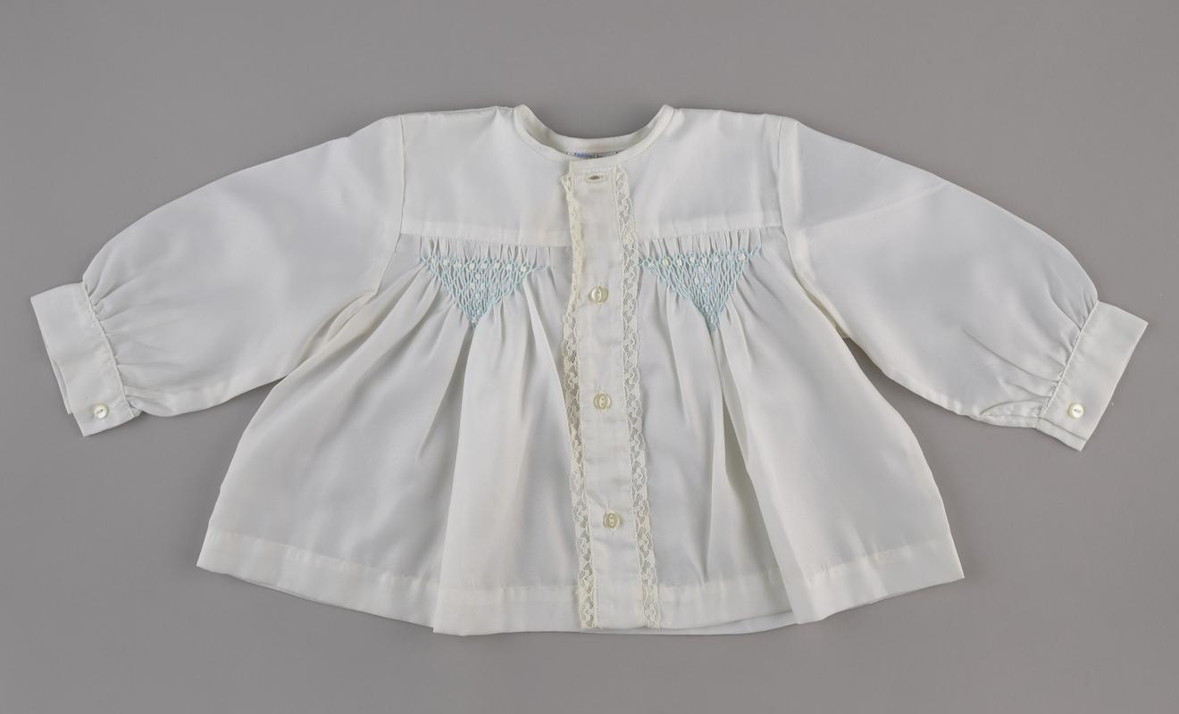 Baby's white cotton lawn frock with dropped waistline, high neckline and long sleeves. Made by Belgian refugee nuns in Newport, Gwent, during the First World War. The bodice is trimmed with two inserted panels of handmade lace featuring shamrocks and roses, with whitework floral motifs around the neckline. Two bands of pin-tuck gathers run along each sleeve, with a panel of lace in between. The skirt also pin-tucked at regular intervals. The cuffs are trimmed with lace.