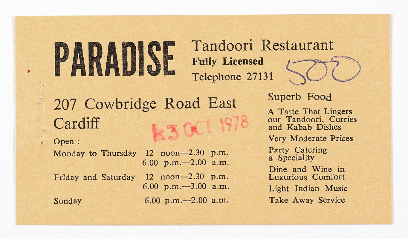 Menu printed for 'Nazma Indian Tandoori Take-Away', Ely, Cardiff.