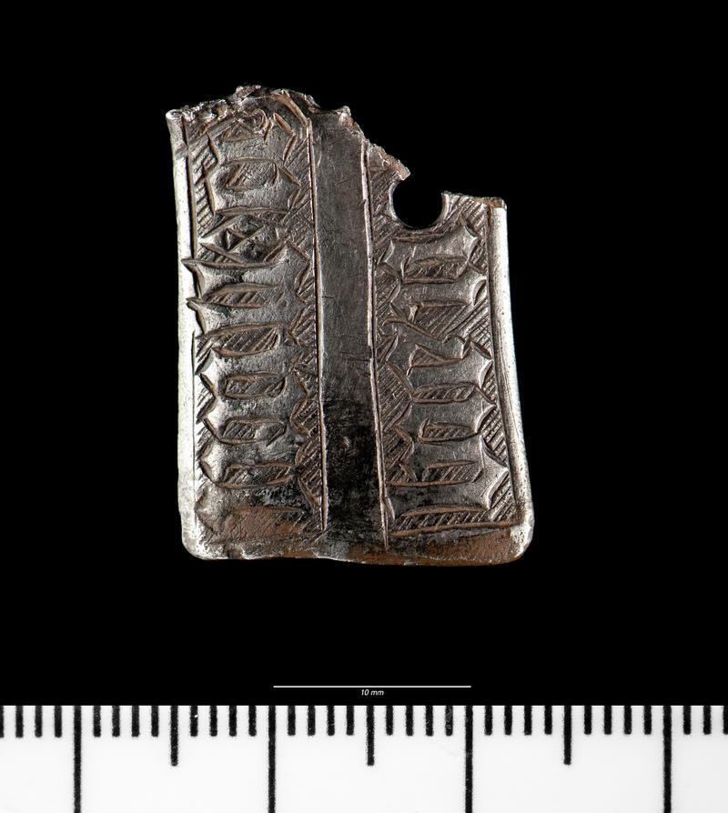 Cast silver-gilt bar-mount for a strap. It has plain solid arms (with flat backs), and hollow end lobes perforated for rivets, one remaining in situ. The large hollow central lobe is decorated with cross-hatched diagonal lines.
