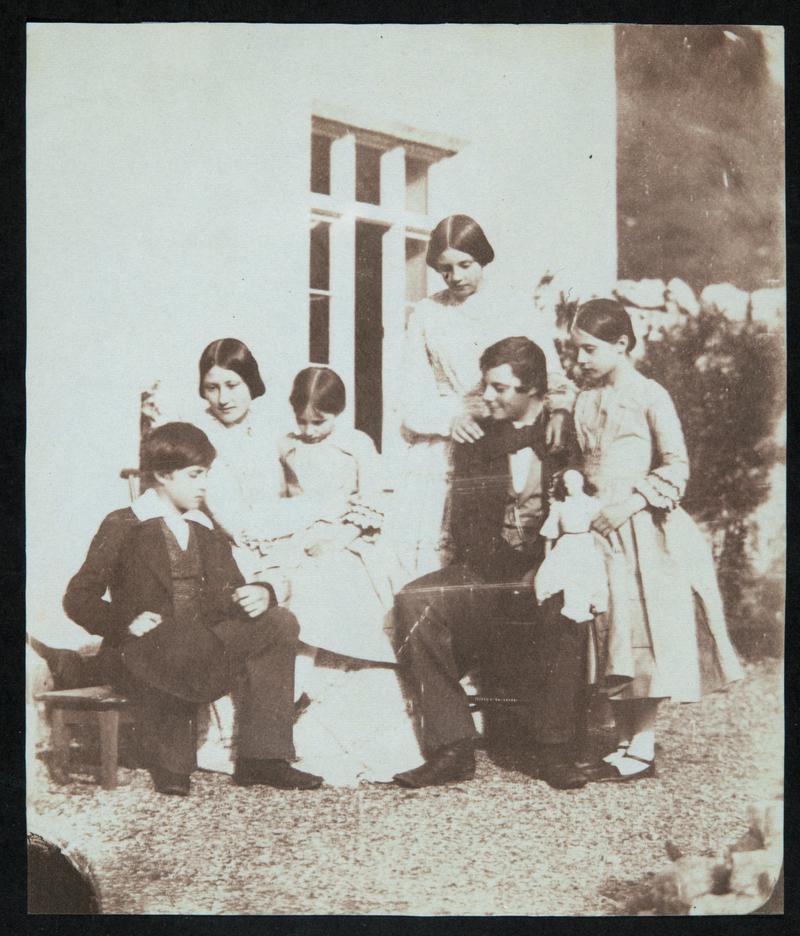 Salted paper print, from Collodion glass negative. The six Llewelyn children outside Penllergare. Left to right Lucy, William, Thereza, John (holding gun), Emma, and Elinor.