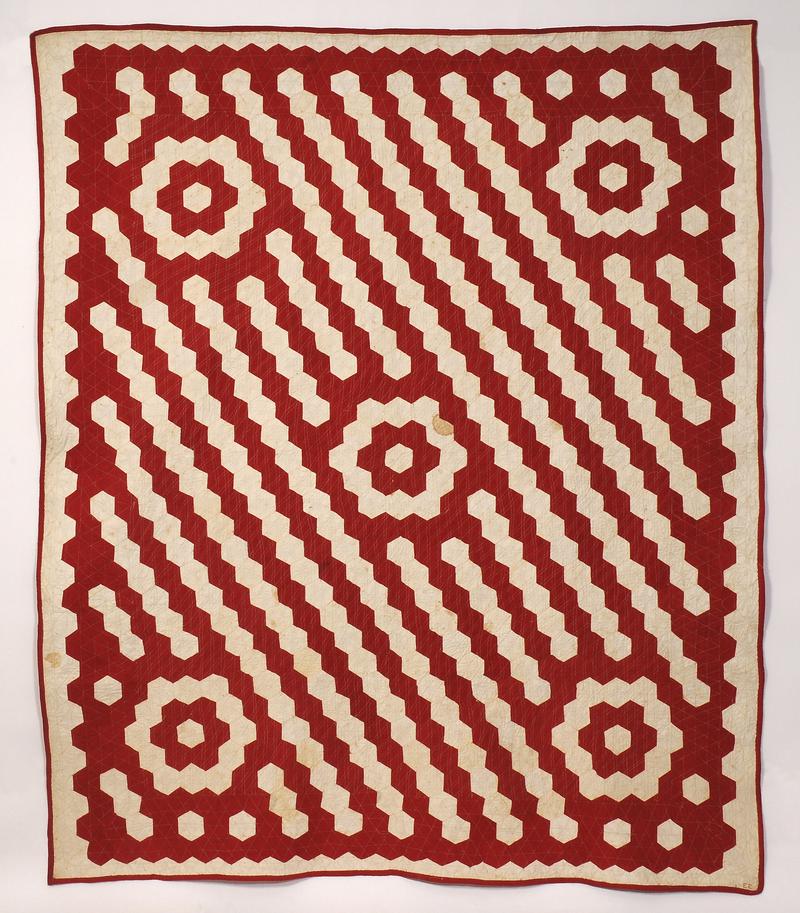 Central design of a red cotton rectangle with white printed inner frame and applied cotton patches featuring a central diamond with triangles in two opposing corners. Those patches have a printed floral design in blue, pink and yellow. Applied cotton patches of two plain lilac squares in the remaining two corners. The patches have turned-back edges and are top stitched by machine using white thread. The central motif is surrounded by a lilac border which is made up of 12 separate pieces of tabby cotton. These are joined by machine stitches. On two sides of the lilac border are long patches of white and pink floral printed cotton; the remaining area pieced together from eight pieces of cream cotton muslin with a printed red, green and brown acorn design. Eight patches of red cotton sateen have been applied on top of the muslin: four square pieces at the corners and four oblong sections along the centre sides. These have been top stitched by machine in black thread.