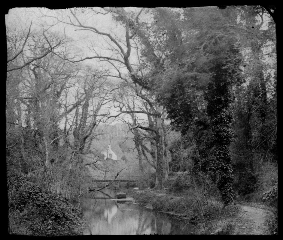 Calotype negative showing rustic bridge over the river as it enters the Upper Lake at Penllergare. Boat, chair, and steps at right. Tab at each corner.