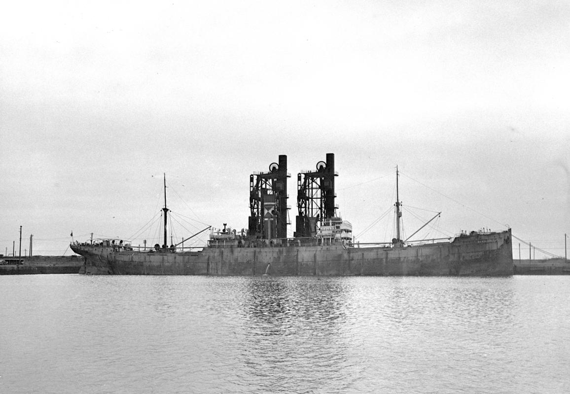 Starboard broadside view of S.S. CALEDONIAN MONARCH at Cardiff Docks, c.1936.