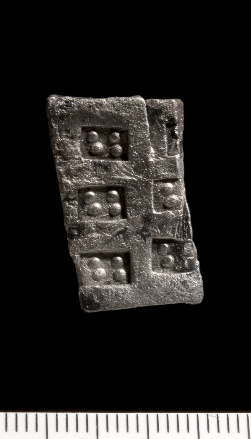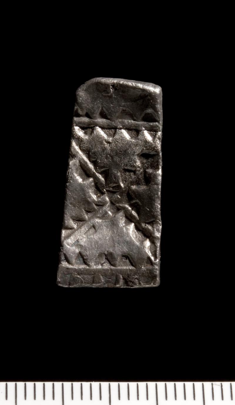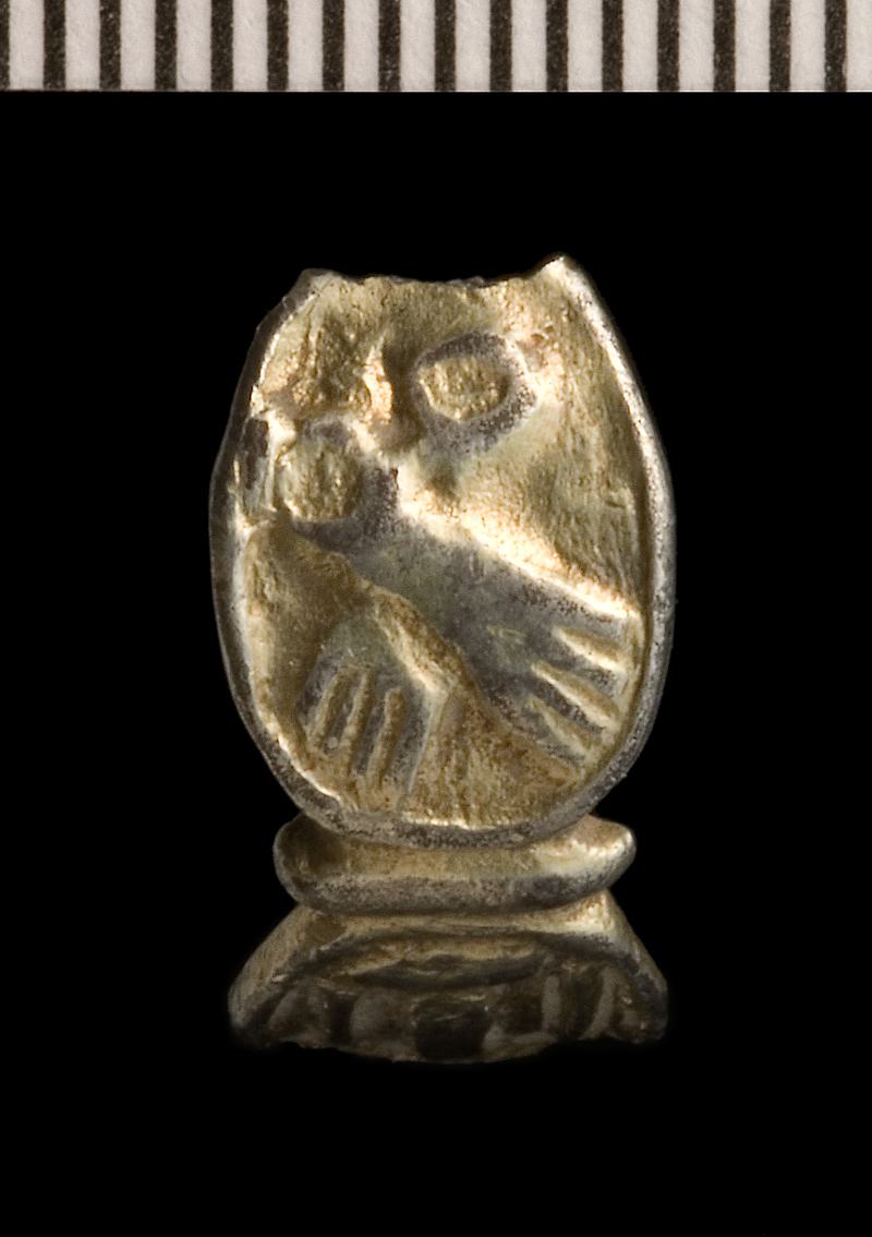 Has a bezel with radiating punched surround and shoulders punched with parallel lines. Has a light yellow cabochon sapphire (now loose).