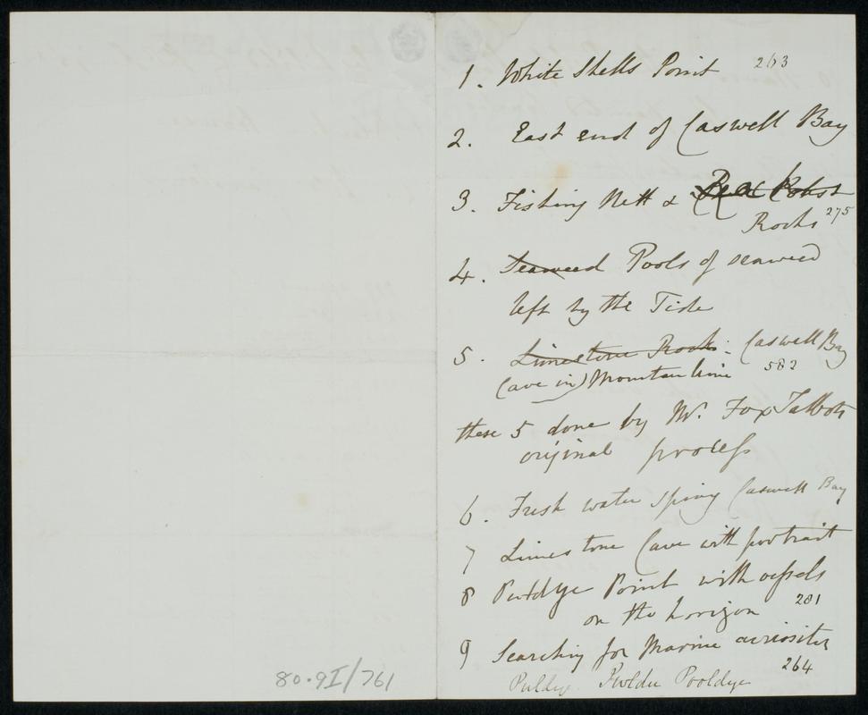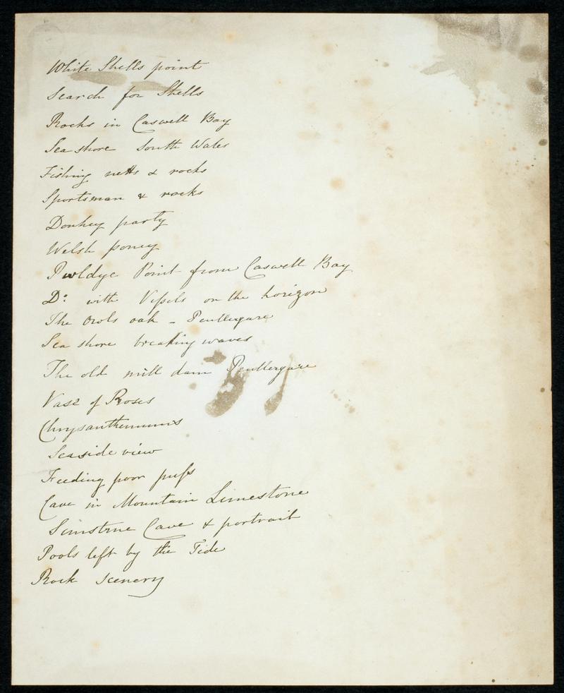 Calotype (negative). Vertical view of the rock face, taken looking upwards, showing stratification andover-hanging rocks. Tabs on all four corners. Possibly taken at Dunraven.
