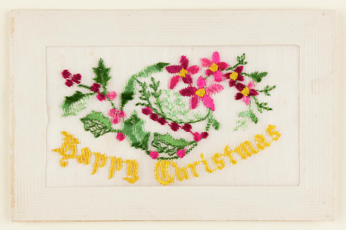 First World War postcard depicting a soldier and a woman about to embrace. With short verse entitled 'Forget-me-not'.