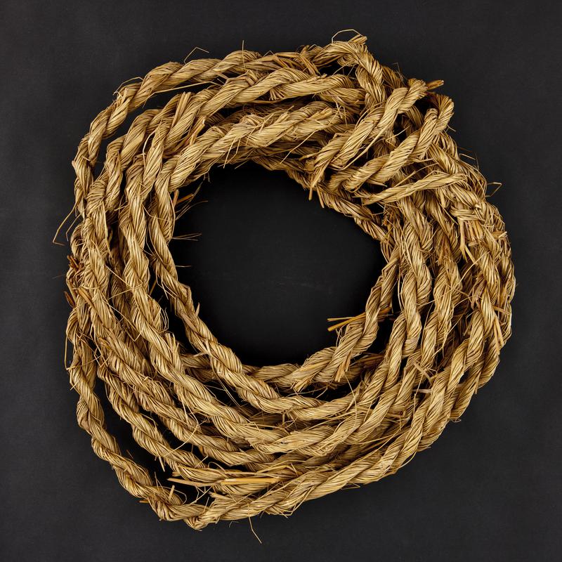 1 edge = selvage, one edge secured with coarse overcast stitches using pale blue cotton, Z-twist, 2 threads used together, one edge secured with coarse overcast stitches using brown cotton, Z-twist, 2 threads used together, one edge secured with thick, bast fibre thread (same as yarn used for weave)