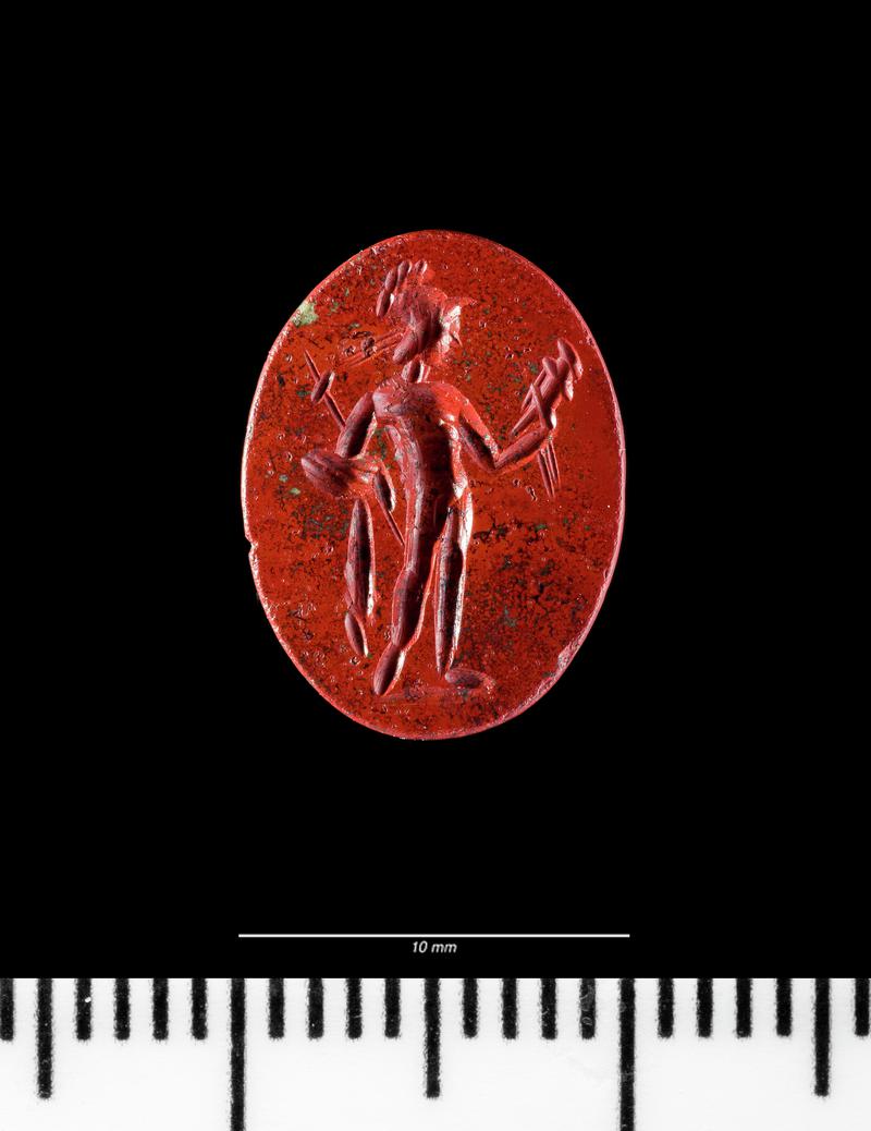 This is one of 88 engraved gemstones retrieved in 1979, mostly from the filling of a large drain beneath the cold hall of the fortress baths. The gemstones would originally have been set in finger-rings, and served as signets and charms or talismans for their owners. They were products of extremely skilled craftsman who worked on a minute scale without the aid of magnification. The gems are engraved with a wide range of deities, personification and symbols.