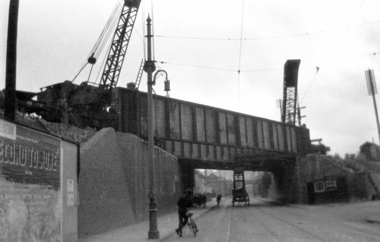 A pair of steam cranes moving bridge section at Caerleon Road, Newport.