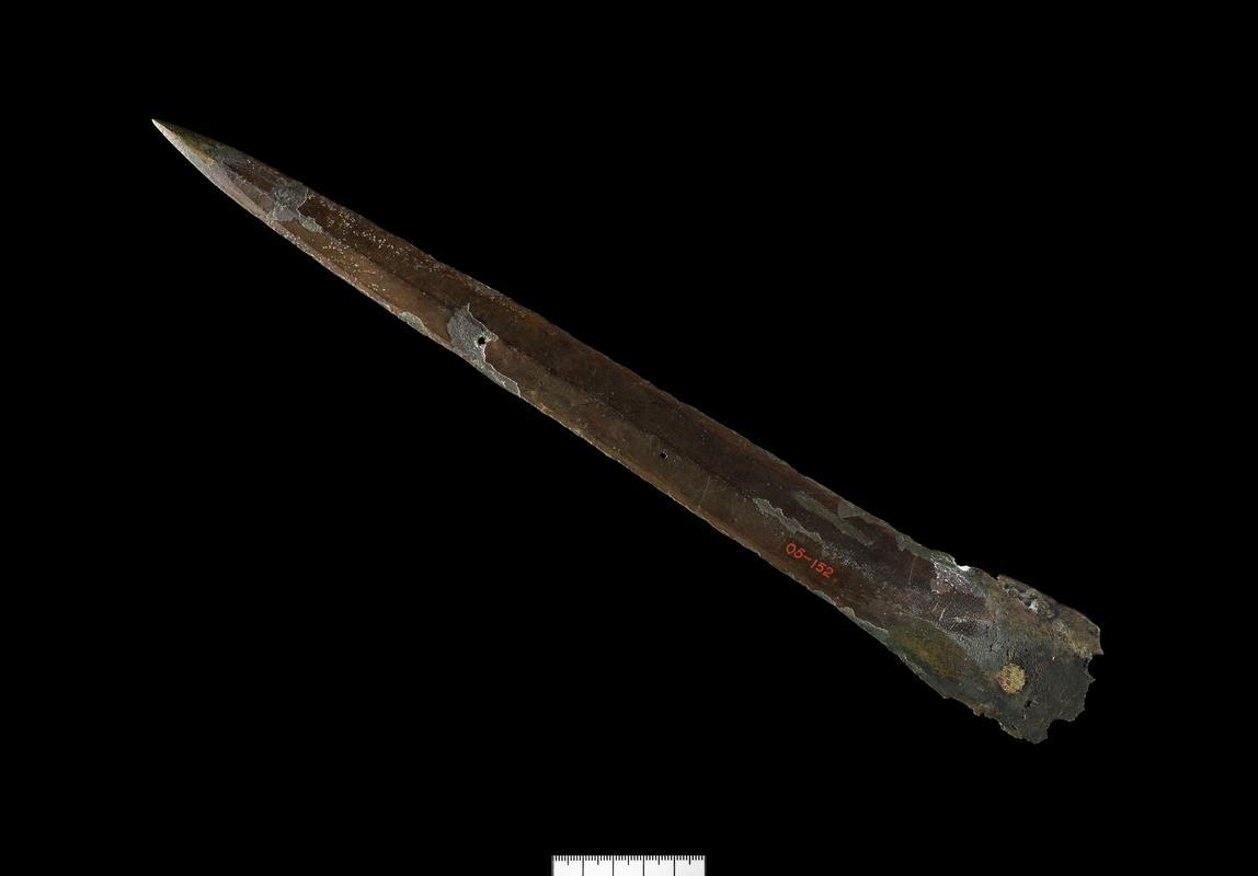 Two fragments of a parallel sided, gently tapering sword blade, with the tip missing. The mid section is slightly rounded with bevelled edges. The lower blade fragment is markedly bent, indicating that the tip was deliberately bent to break the blade. Notches along the blade edges may indicate use or deliberate destruction of the sword.