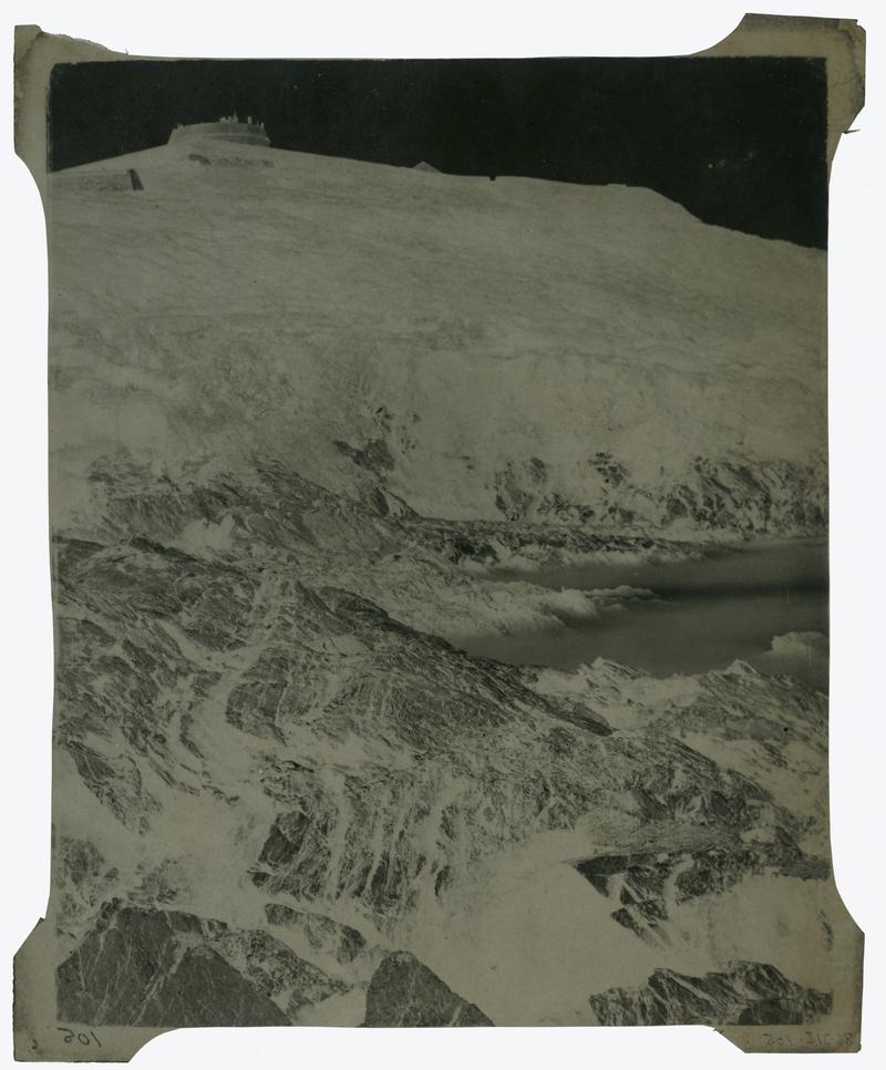 Calotype (negative). View of St Catherine's Rock, Tenby with beach and beach huts in foreground