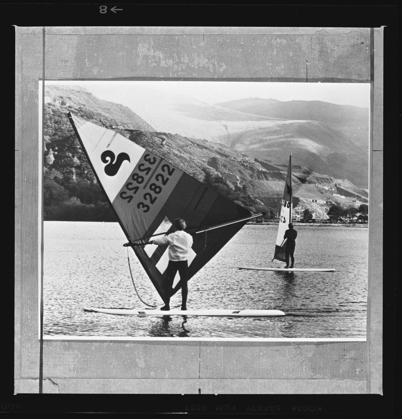 Wind surfers on Padarn Lake, with Dinorwig Quarry in the background.