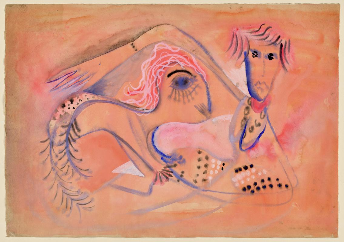 Colour photograph of a naked elderly couple embracing. This is part of a series of six works exploring the myth of sexual loss in elderly people. She invited volunteers between the ages of 60 and 90 to participate as models.